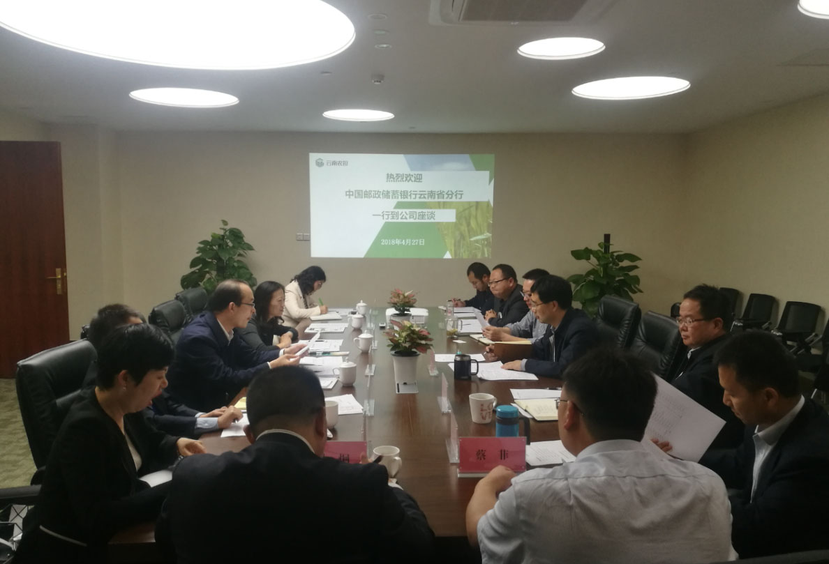 2018年4月27日,中國郵政儲蓄銀行云南省分行孟浩副行長一行到省農(nóng)擔(dān)公司座談,公司郭影董事長、杜開波總經(jīng)理、廖寅皓副總經(jīng)理及各部門負責(zé)人出席會議,雙方就下一步展開深度合作展開座談。