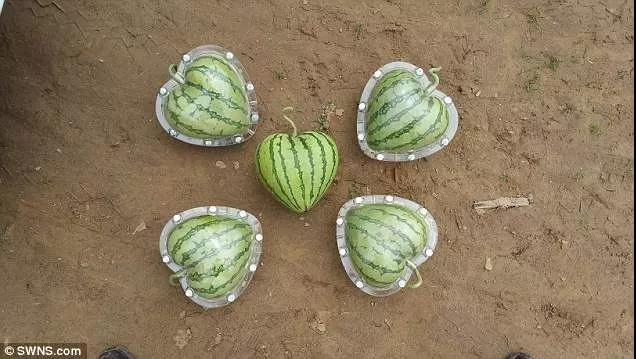 其實,形狀各異的西瓜是靠模具壓制而成的。當(dāng)西瓜生長至幼瓜階段時,將它們放置在方形、元寶形和心形的塑料模具中,生長期間,西瓜會一直受到模具擠壓,在撤離模具后,就成了各式的形狀。