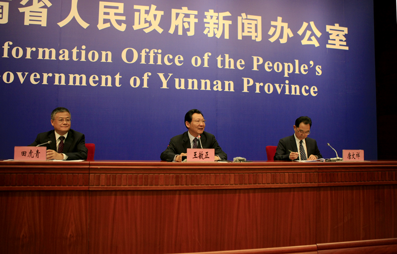 云南省人民政府新聞辦公室專職副主任田虎青主持發(fā)布會,云南省打造世界一流“綠色食品牌”工作領導小組辦公室主任、省委農辦主任、省農業(yè)廳廳長王敏正,云南省工業(yè)和信息化委員會副書記、副主任唐文祥分別發(fā)布新聞。