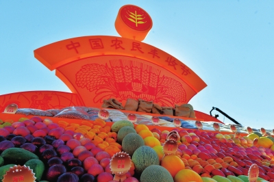 9月23日,首屆中國農(nóng)民豐收節(jié)主會(huì)場(chǎng)慶典現(xiàn)場(chǎng),優(yōu)質(zhì)農(nóng)產(chǎn)品組成的巨型花壇果香色艷,展示著農(nóng)業(yè)綠色發(fā)展成就。