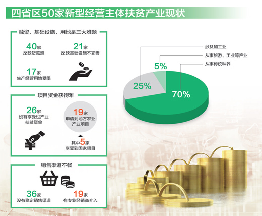 據(jù)調(diào)查,受訪的50家新型經(jīng)營(yíng)主體中,80%的主體反映“差錢”。資金難是扶貧產(chǎn)業(yè)發(fā)展的主要瓶頸。