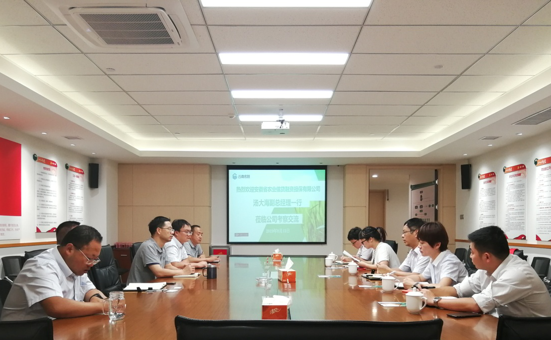 7月23日-7月25日,安徽省農(nóng)業(yè)信貸融資擔保有限公司(以下簡稱安徽農(nóng)擔)副總經(jīng)理湯大海率隊赴云南省農(nóng)擔公司調研交流。公司董事長郭影、副總經(jīng)理廖寅皓率風控部、戰(zhàn)略部與安徽農(nóng)擔公司進行了座談交流。