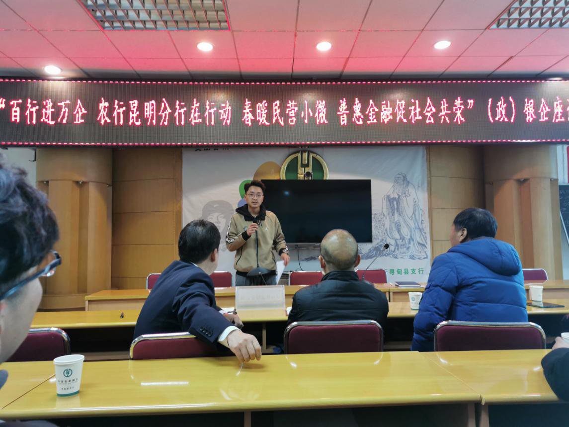 1月8日下午,受農(nóng)業(yè)銀行尋甸縣支行邀請,尋甸辦事處韓雙營、段浩參加“百行進萬企,農(nóng)行昆明分行在行動,春暖民營小微,普惠金融促社會共榮”(政)銀企座談會。人民銀行尋甸縣支行行長李凱、農(nóng)業(yè)銀行尋甸縣支行行長馬繼軍、金所產(chǎn)業(yè)園區(qū)財政局局長秦菲及尋甸當(dāng)?shù)匦∥⑵髽I(yè)代表參加本次座談。