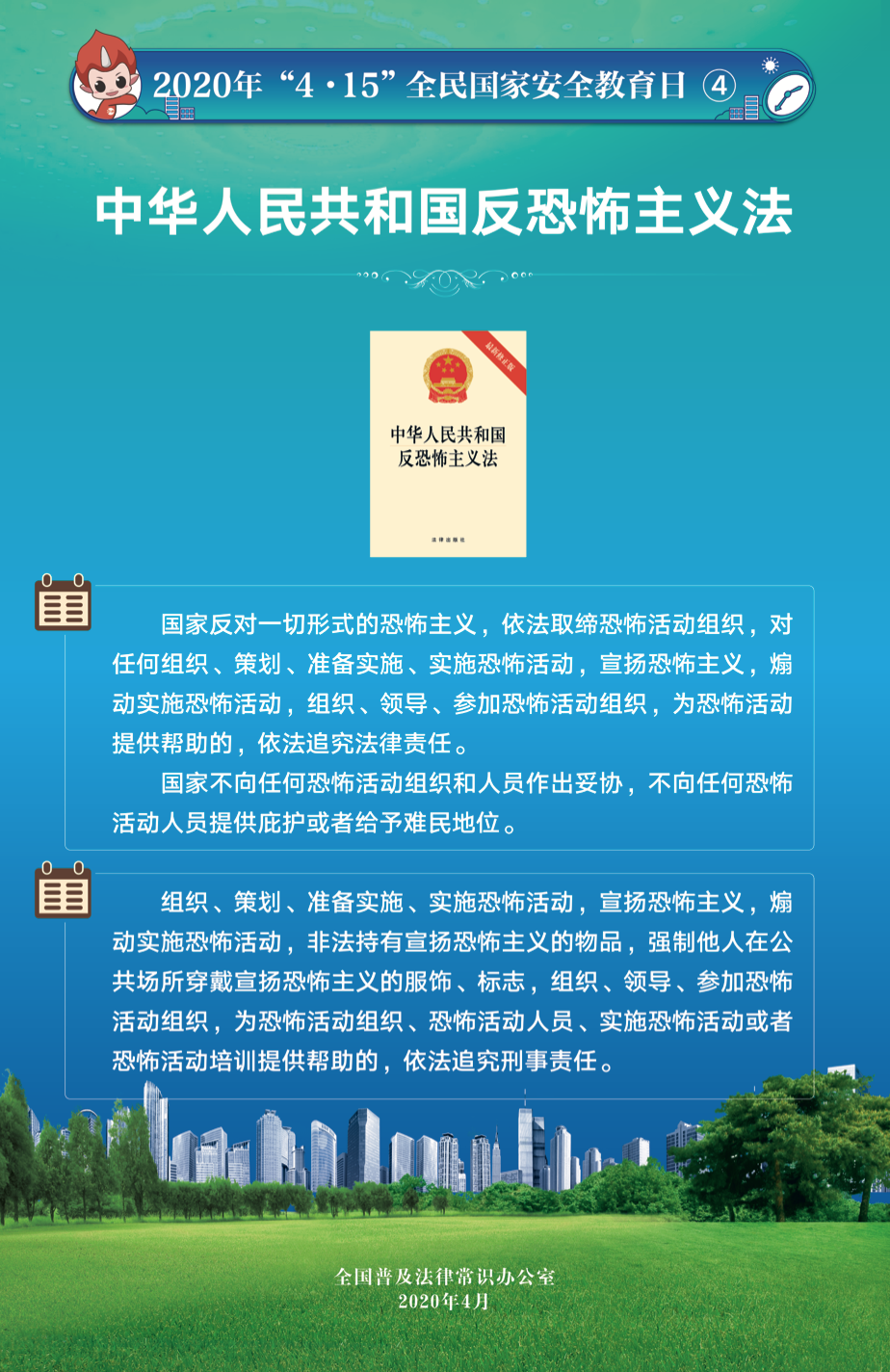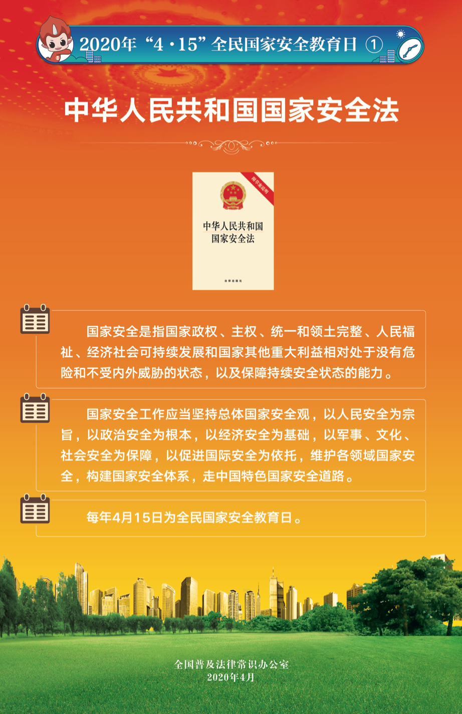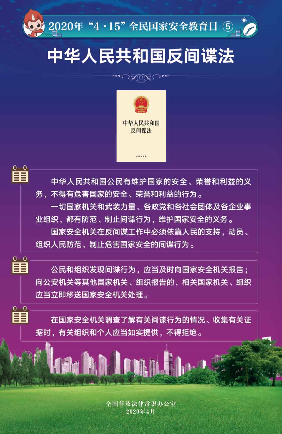 2015年7月1日全國人大常委會通過的《國家安全法》將每年4月15日定為全民國家安全教育日,2020年4月15日是我國第五個全民國家安全教育日。