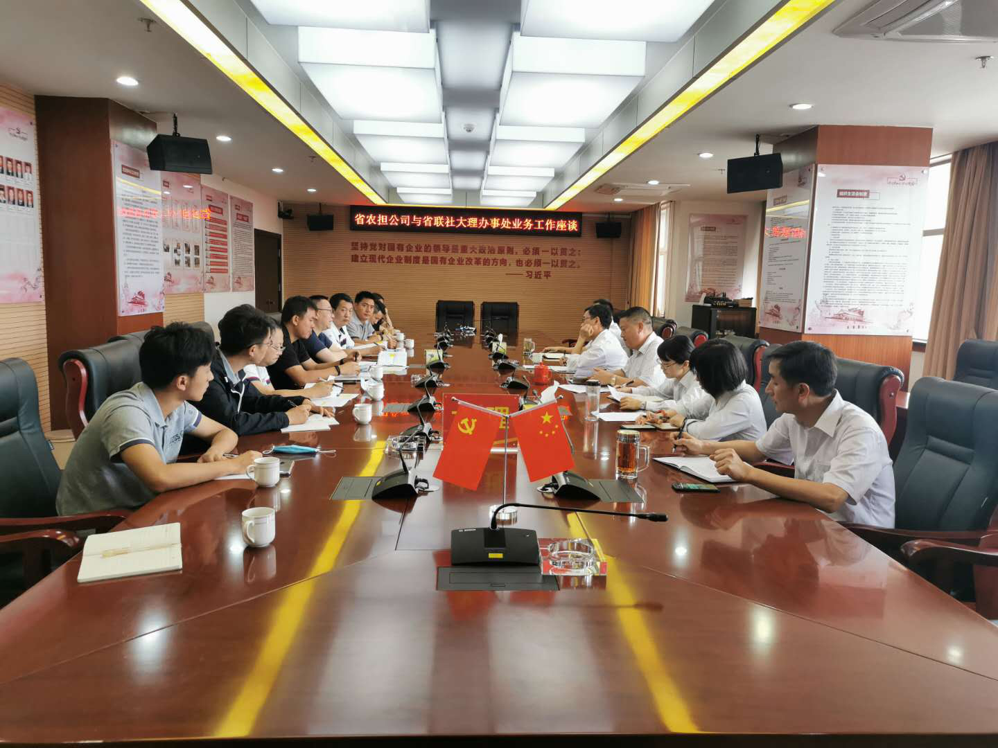 6月19日,調(diào)研組一行到省聯(lián)社大理辦事處座談。雙方就目前合作的情況以及業(yè)務(wù)進行深入交流,省聯(lián)社大理辦事處黃景勝主任表示,通過此次交流活動,加強了雙方溝通互信,將依托大理州較好的信用環(huán)境,充分發(fā)揮信用社業(yè)務(wù)優(yōu)勢,加強與省農(nóng)擔公司合作,在風險可控前提下積極擴大農(nóng)擔業(yè)務(wù)覆蓋面。