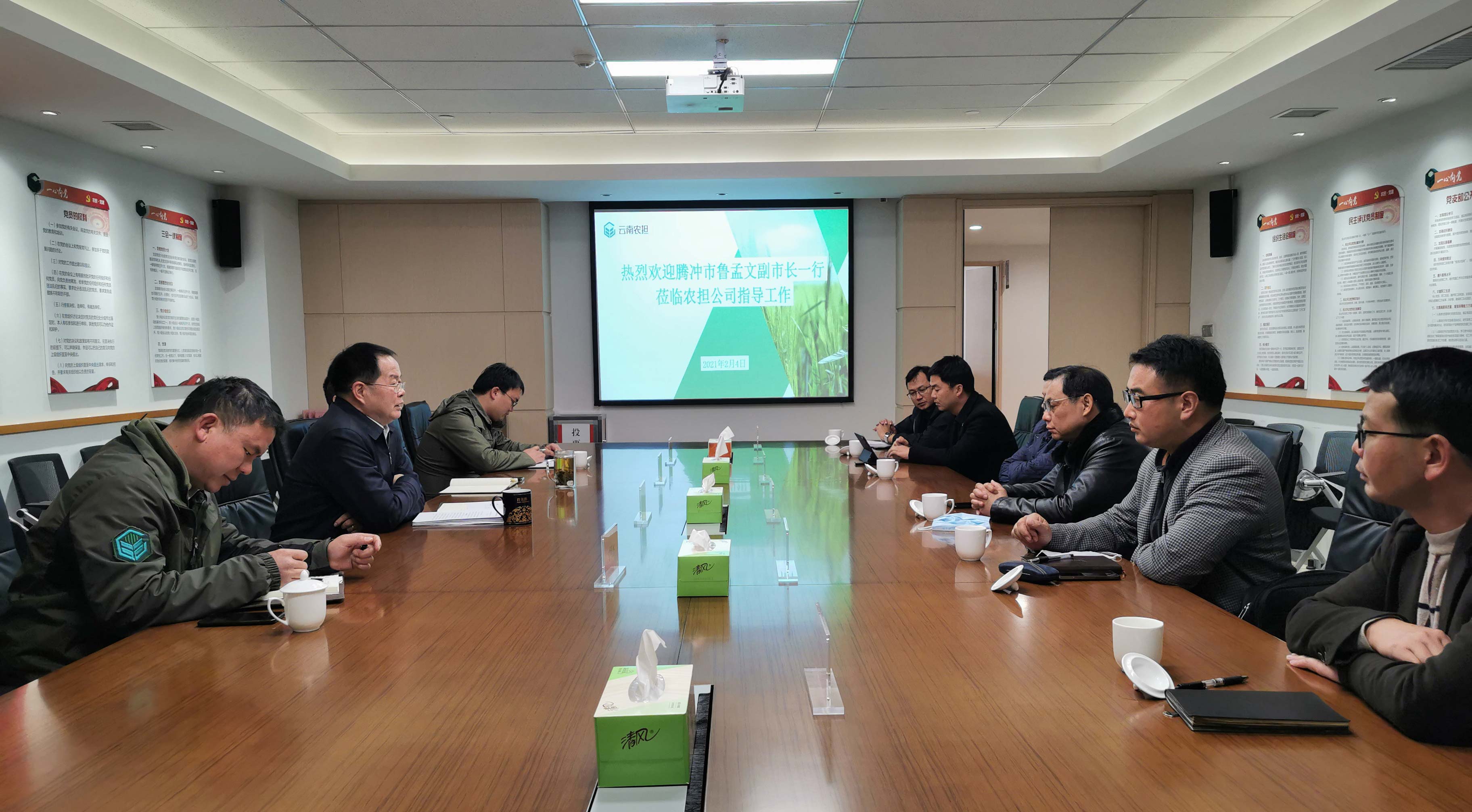 杜開(kāi)波總經(jīng)理代表郭影董事長(zhǎng)及公司領(lǐng)導(dǎo)向魯副市長(zhǎng)一行表示歡迎,并就云南農(nóng)擔(dān)的發(fā)展歷程、政策定位、業(yè)務(wù)方向進(jìn)行了詳細(xì)介紹。杜開(kāi)波總經(jīng)理表示,騰沖作為農(nóng)業(yè)擔(dān)保重點(diǎn)縣市,農(nóng)業(yè)基礎(chǔ)較好、農(nóng)業(yè)市場(chǎng)廣闊,為做大做強(qiáng)騰沖農(nóng)業(yè)產(chǎn)業(yè),引入農(nóng)擔(dān)機(jī)構(gòu),服務(wù)騰沖金融市場(chǎng),雙方的考慮可謂不謀而合。農(nóng)擔(dān)公司將秉承“為農(nóng)不虧損,為農(nóng)不盈利”的政策定位,深入貫徹黨中央、國(guó)務(wù)院關(guān)于鄉(xiāng)村振興戰(zhàn)略和十四五規(guī)劃,為云南省打造“世界一流綠色食品牌”積極主動(dòng)做為,為騰沖農(nóng)業(yè)增收、產(chǎn)業(yè)興旺,建設(shè)“美麗騰沖”做出應(yīng)有的貢獻(xiàn)。