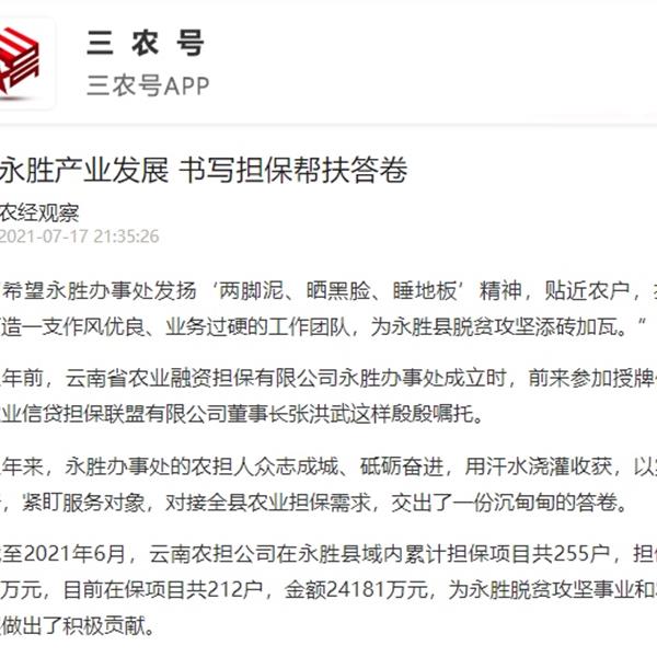2021年7月17日,《農(nóng)民日報》三農(nóng)號以“助力永勝產(chǎn)業(yè)發(fā)展 書寫擔(dān)保幫扶答卷”為題對云南農(nóng)擔(dān)永勝辦事處進(jìn)行了專題報道。
